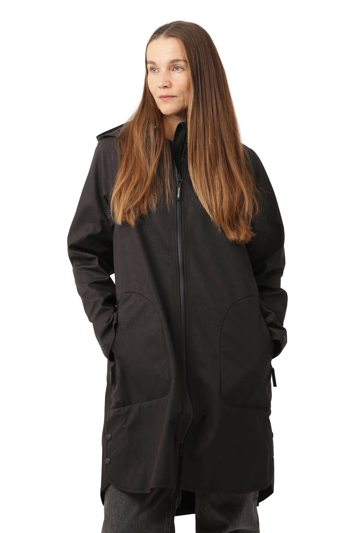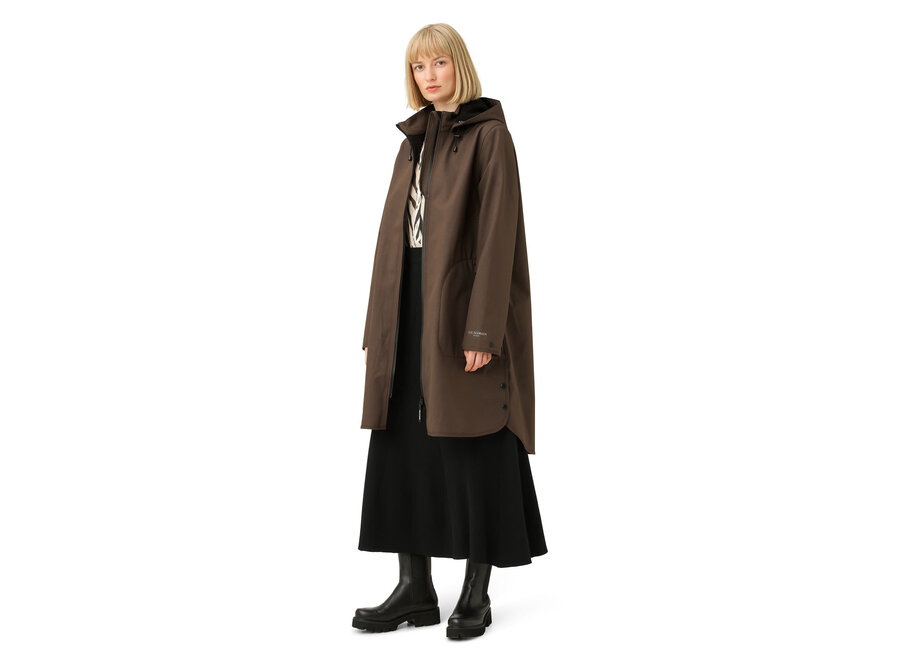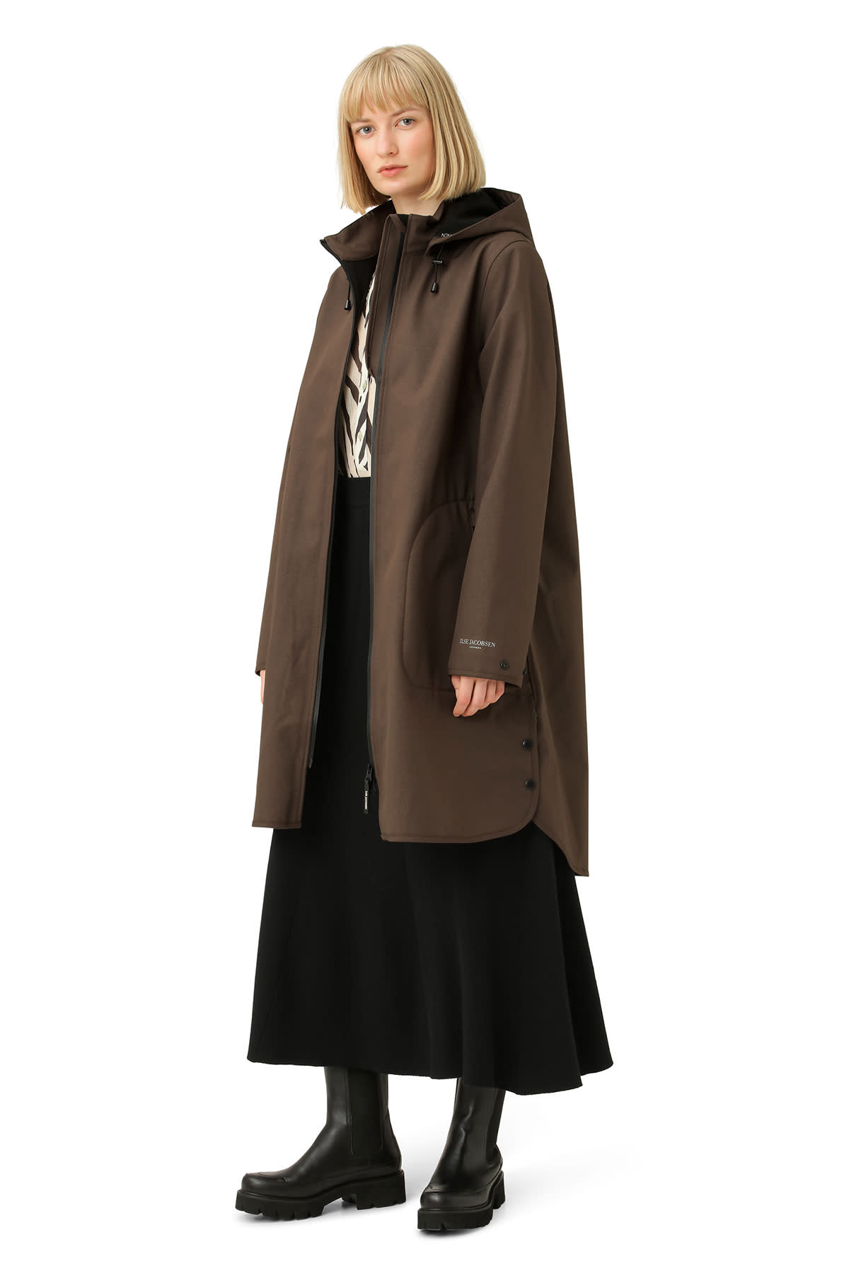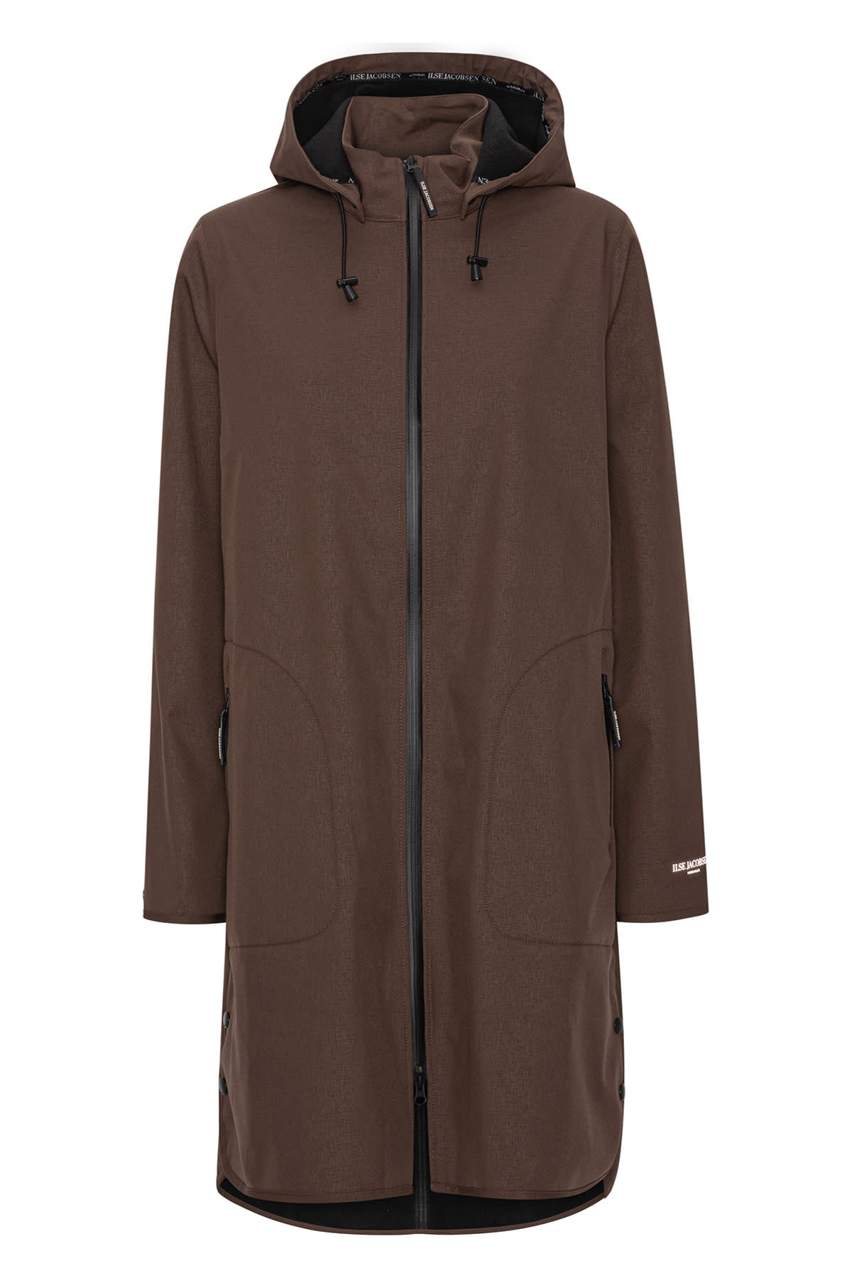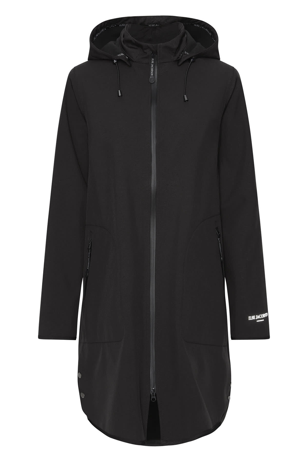 A feminine and functional raincoat Rain128 is in a flattering and comfortable a-shaped silhouette. Style is made of breathable soft shell material and body length is just below the knee. Featuring: a detachable hood, slits in side seams with press buttons, button closure at arm wrist, Ilse Jacobsen Hornbæk reflective logo on left sleeve and a YKK 2-way aqua guard zipper along centre front and at pockets. This functional material resists water pressure up to 5000 mm. Fabrication has Eco-repel a water and dirt repellent coating. All seams are taped.