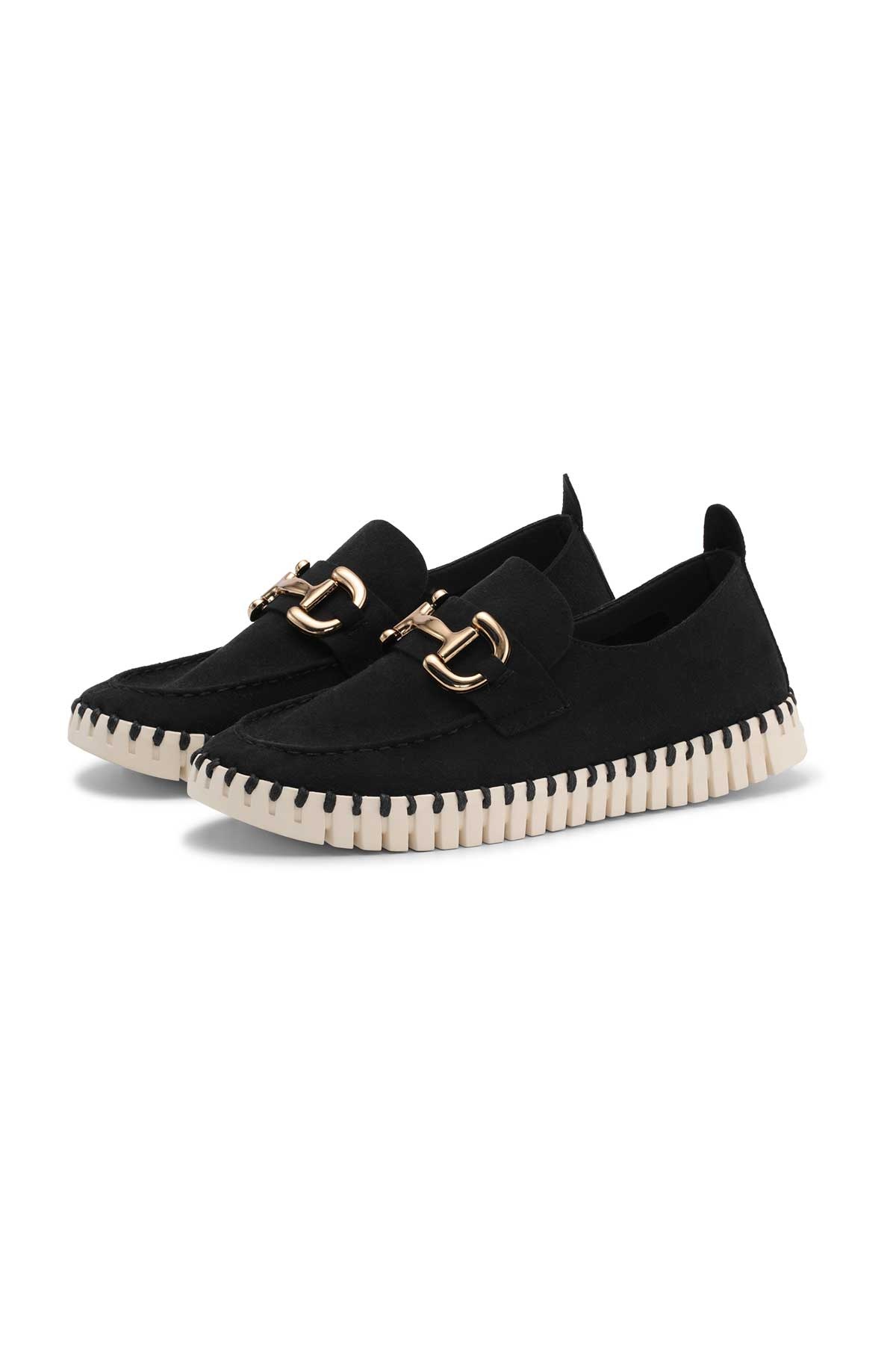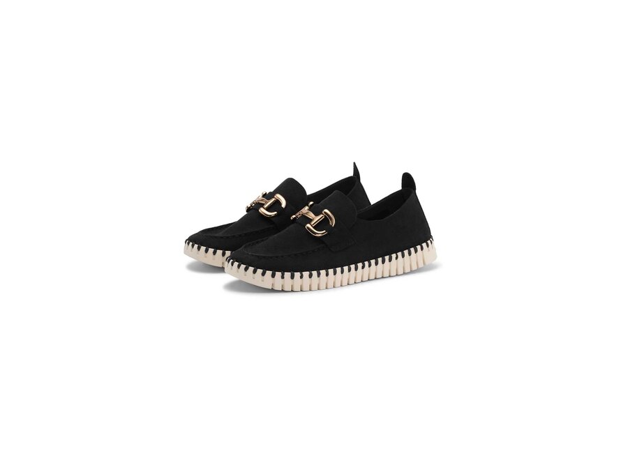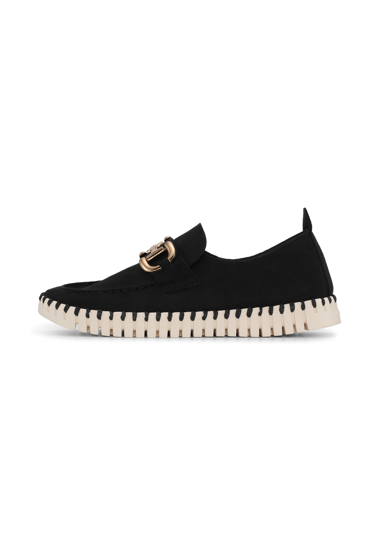 The Tulip Loafer TULIP3874 with a golden buckle from Ilse Jacobsen, inspired by the famous Tulip slip-on, gives the classic loafer a new twist. The upper is made of recycled microfiber. The bottom features our iconic Tulip outsole in a matching color. The shoe is made of 75% natural rubber and 25% recycled rubber, with matching colored and recycled thread, without glue. The insole, lined with pig leather, provides cushioning and support, ensuring great comfort.